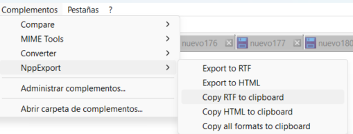 - Ahora para copiar el código en formato Word debe de aplicarse el siguiente comando Complementos -> NppExport ->Copy RTF to Clipboard.