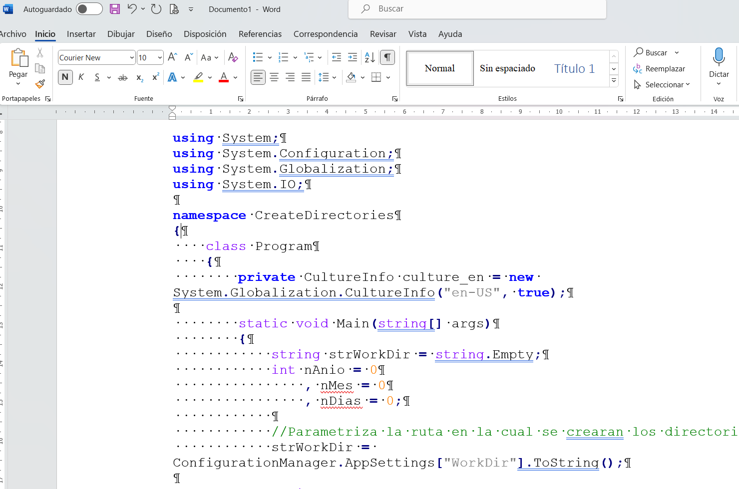 - Copiar el código del programa el cual queremos transportar con formato de Word.