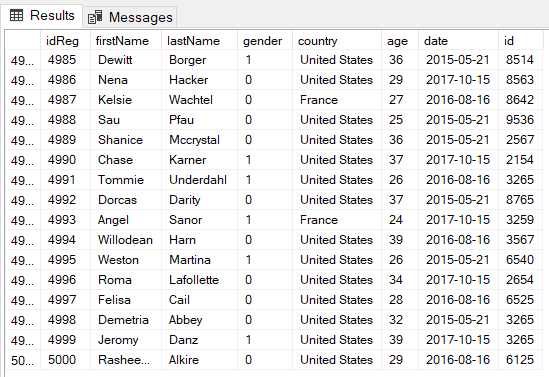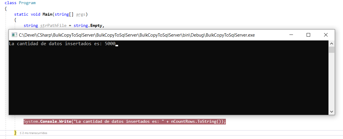 Con lo anterior hemos realizado la inserción con el metodo BulkCopy ahora lo que haremos será es una rapida comprobación de los datos insertados en la base y eso lo hacemos con el siguiente código: