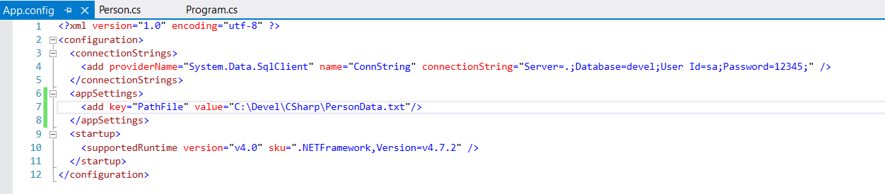 '<'add providerName="System.Data.SqlClient" name="ConnString" connectionString="Server=.;Database=devel;User Id=sa;Password=12345;" />