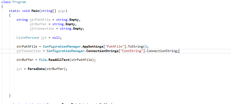 Tomaremos como base el ejercicio anterior donde abrimos y parseamos el archivo que contienen datos de las personas para enfocarnos en la inserción con este metodo, aca te dejo el link correspondiente para que puedas darle una revisada y si te sirve utilizar el código del mismo. Bien, como vemos en la imagen nuestro programa ya tiene un poco de código, el cual la declaración de variables para leer el archivo y hacerle su parsing, así que tomando como base esto procederemos al siguiente paso.