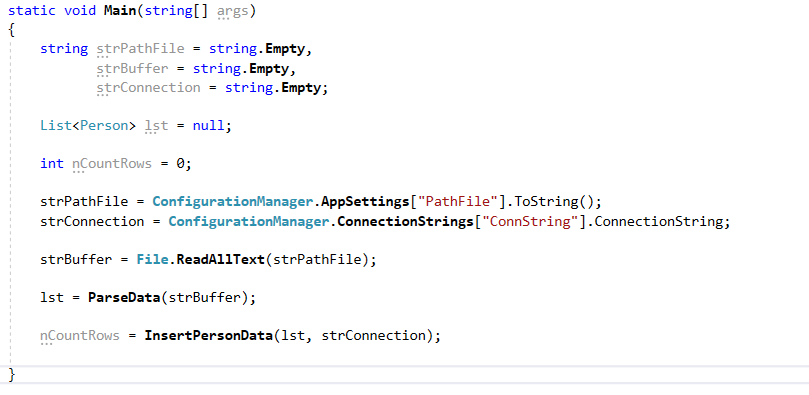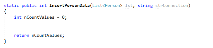 Ahora si, viene lo interesante por hacer, declararemos un metodo que se llamara InsertPersonData al cual le pasaremos 2 parametros y nos regresara 1 de tipo int,el primero será la lista de datos tipo Person que ya trabajamos anteriormente y el segundo será la cadena de conexión que acabamos de configurar, el dato que nos regresara será un conteo de los datos insertados en la tabla en la base de datos, quedando de la siguiente forma: