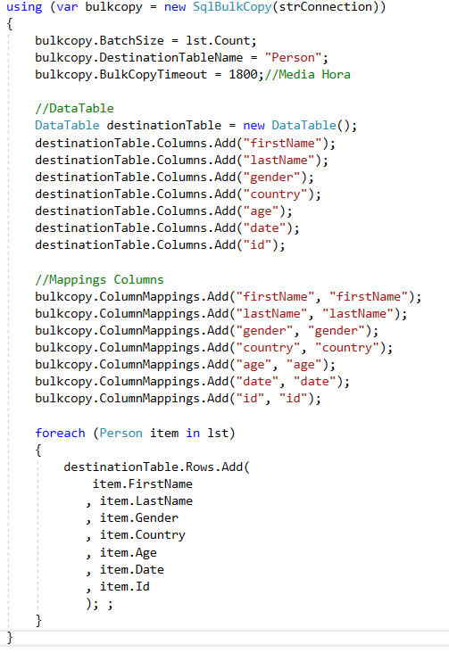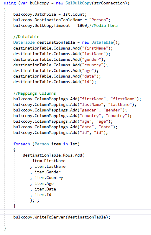 Ahora toca el turno a llenar el objeto DataTable con los datos que queremos insertar, eso lo realizamos con un foreach recorriendo la lista de tipo Person y eso lo realizamos con el siguiente código: