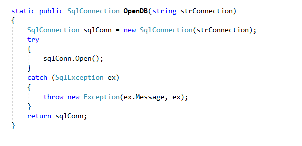 static public SqlConnection OpenDB(string strConnection)