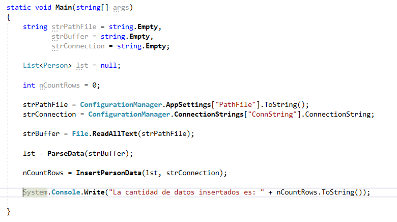 Bien, ya para finalizar nuestra programación nos regresamos a nuestro metodo Main e insertamos al final del metodo una linea que imprime en pantalla el numero de registros insertados en la base de datos.