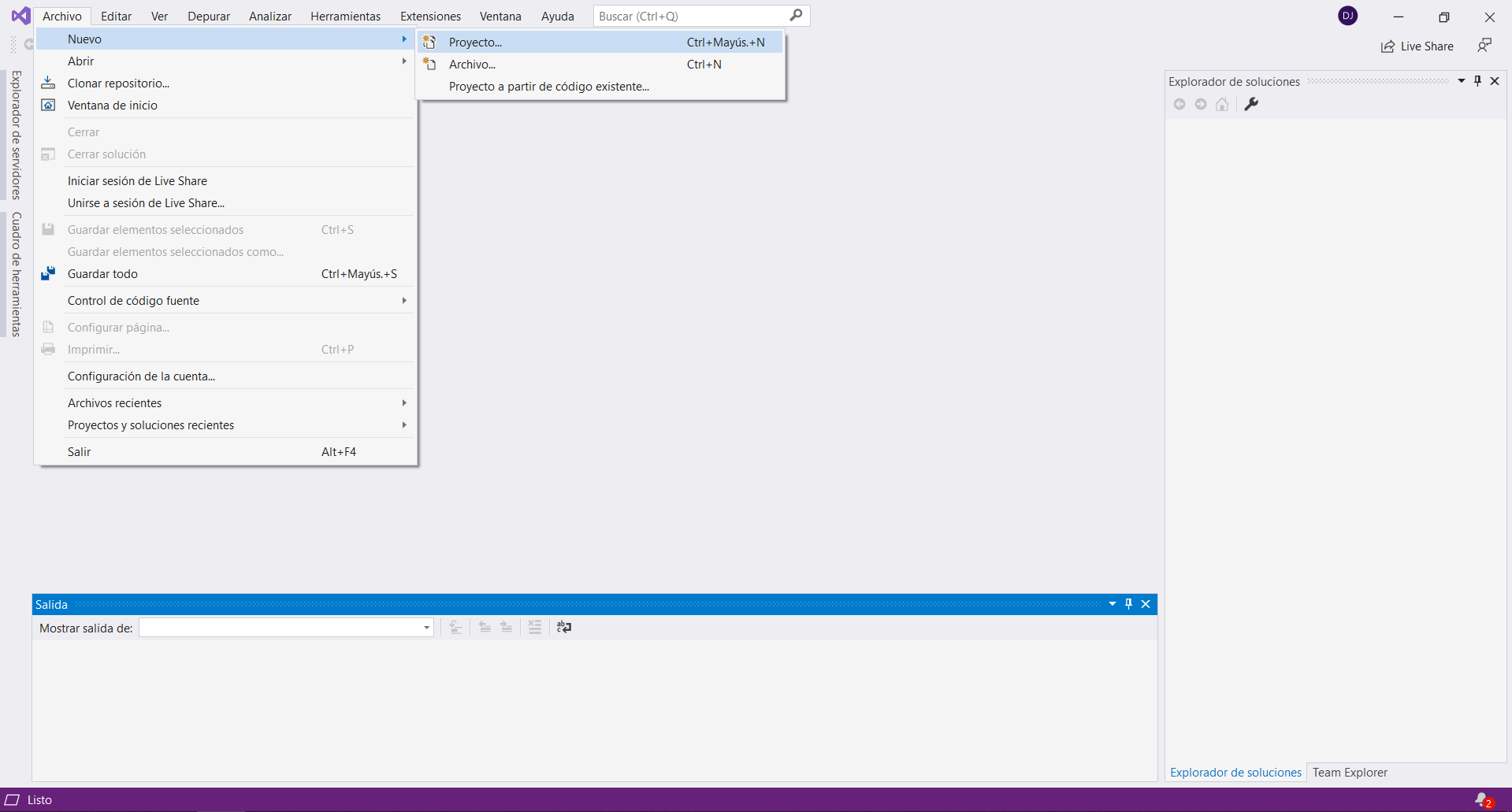 En cuanto lo tengamos abierto, iremos al menu Archivo -> Nuevo -> Proyecto
