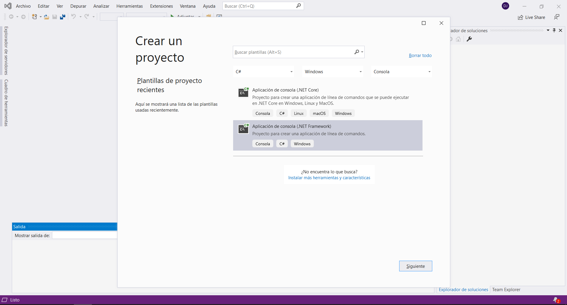 Se mostrara una ventana donde seleccionaremos el Lenguaje que sera C# en Plataforma seleccionaremos Windows , despúes Tipo de Proyecto será Consola y finalmente seleccionaremos Aplicación de Consola (.NET Framework) y quedara de la siguiente forma: