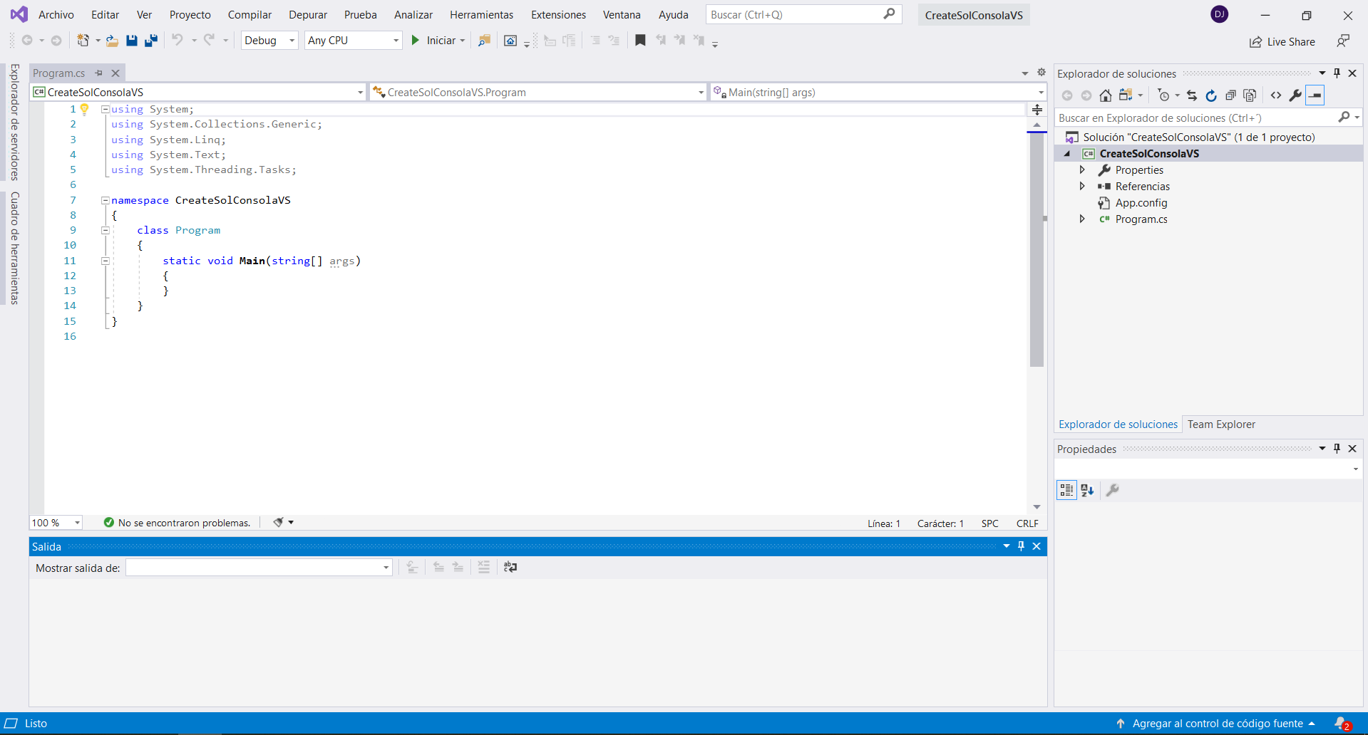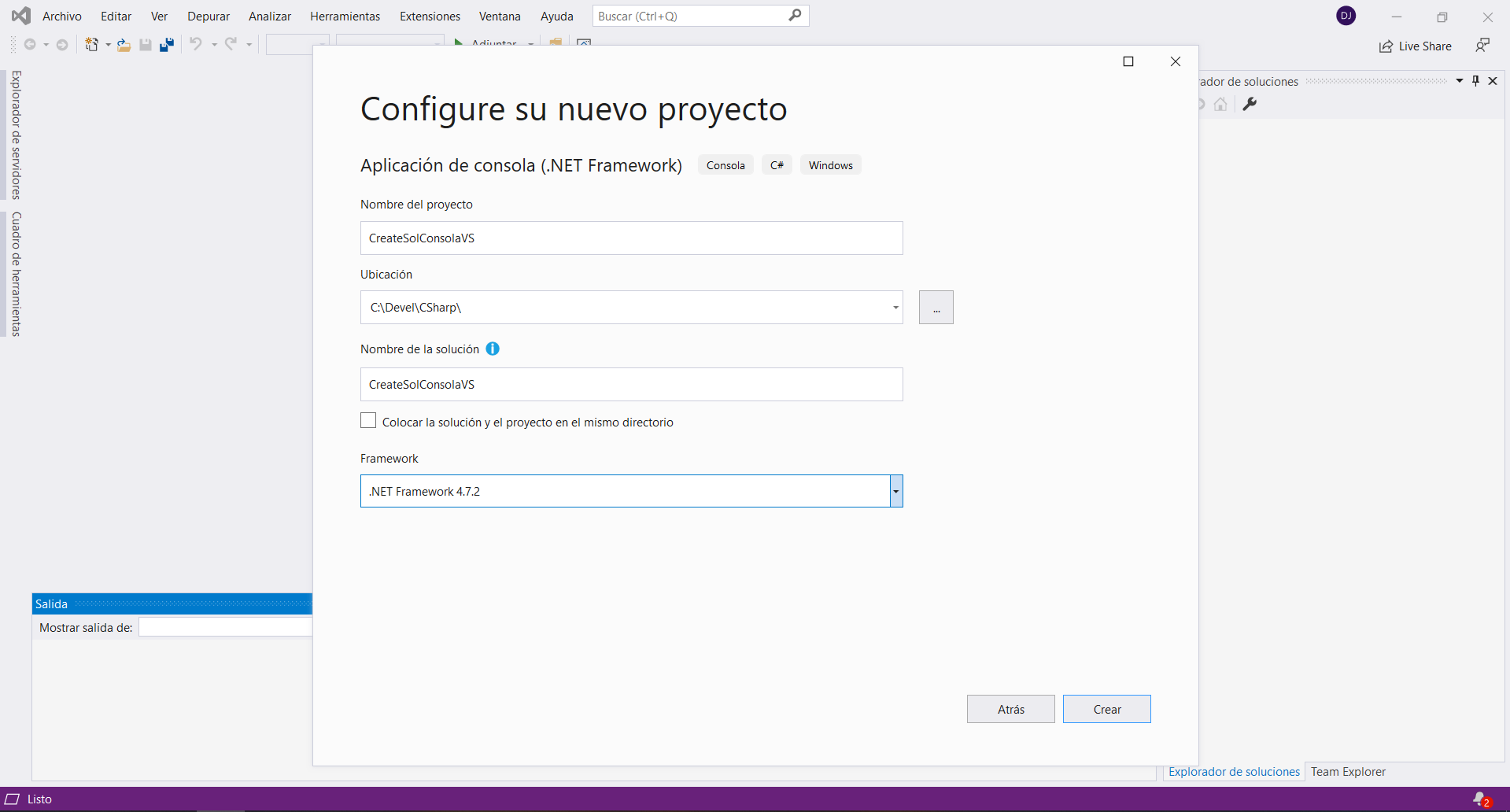 Crear Solución de Consola en Visual Studio