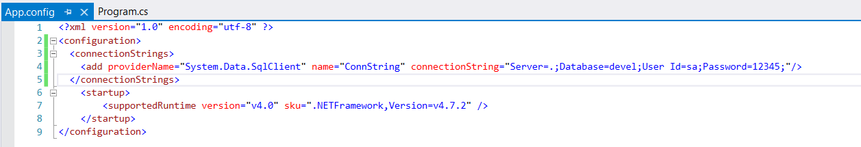 '<'add providerName="System.Data.SqlClient" name="ConnString" connectionString="Server=.;Database=devel;User Id=sa;Password=12345;"/>
