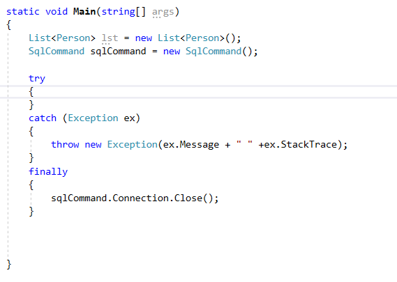 Así mismo declaramos en el mismo metodo Main un bloque try catch con su respectivo finally donde declaramos un cierre de la conexión a la base de datos siempre que se termine de ejecutar codigo en el bloque. Para terminar configuraremos el catch para recibir cualquier excepción que se produzca en la ejecución, quedando de la siguiente forma:
