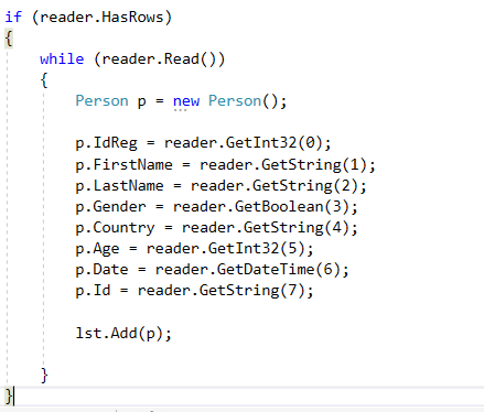 Una vez realizada la ejecución de la instruccción y verificando que el objeto SqlDataReader con la instrucción HasRows contiene valores, procederemos a leerlos con la instruccción while(read.Read()) y llenando un objeto tipo Person por cada linea devuelta y agregandola a la lista antes declarada.