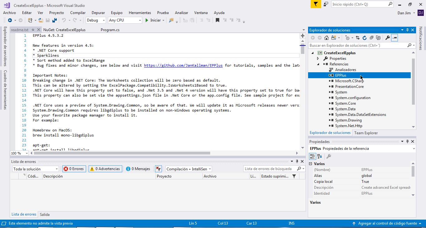 Al finalizar, podremos visualizar que ya en nuestro explorador de soluciones esta la libreria Eppplus.