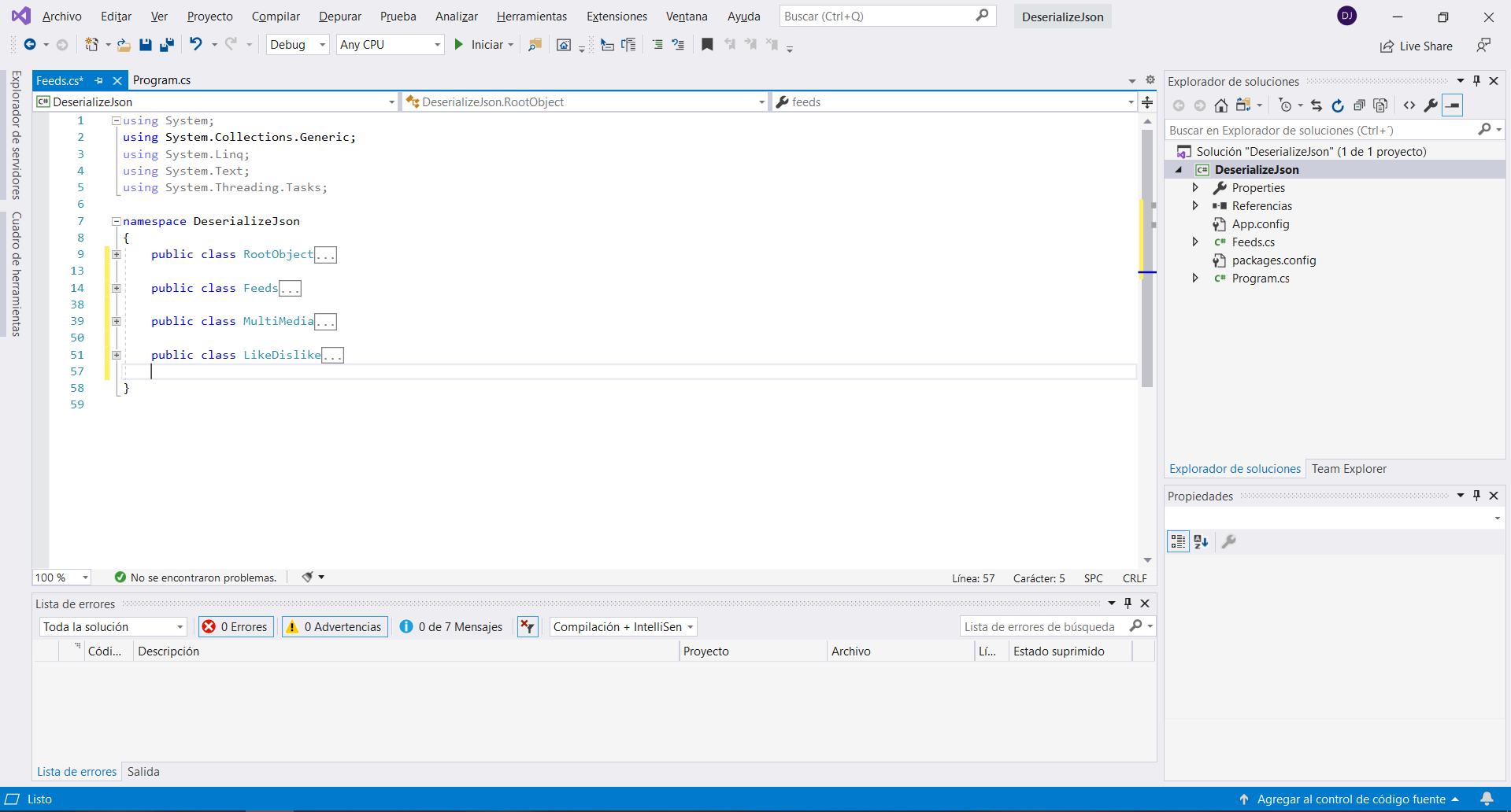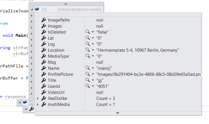 Al finalizar tendremos 4 clases(en mi caso) que seran las que alojaran nuestro Json con la estructura anterior, debo añadir que la clase RootObject es para indicar nuestra raiz del Json y si se fijan en la clase Feeds existe una lista y un IDictionary ya que el primero es un arreglo de propiedad Multimedia y LikeDislike es un Diccionario, dejo el link para descargar la clase como queda al final: