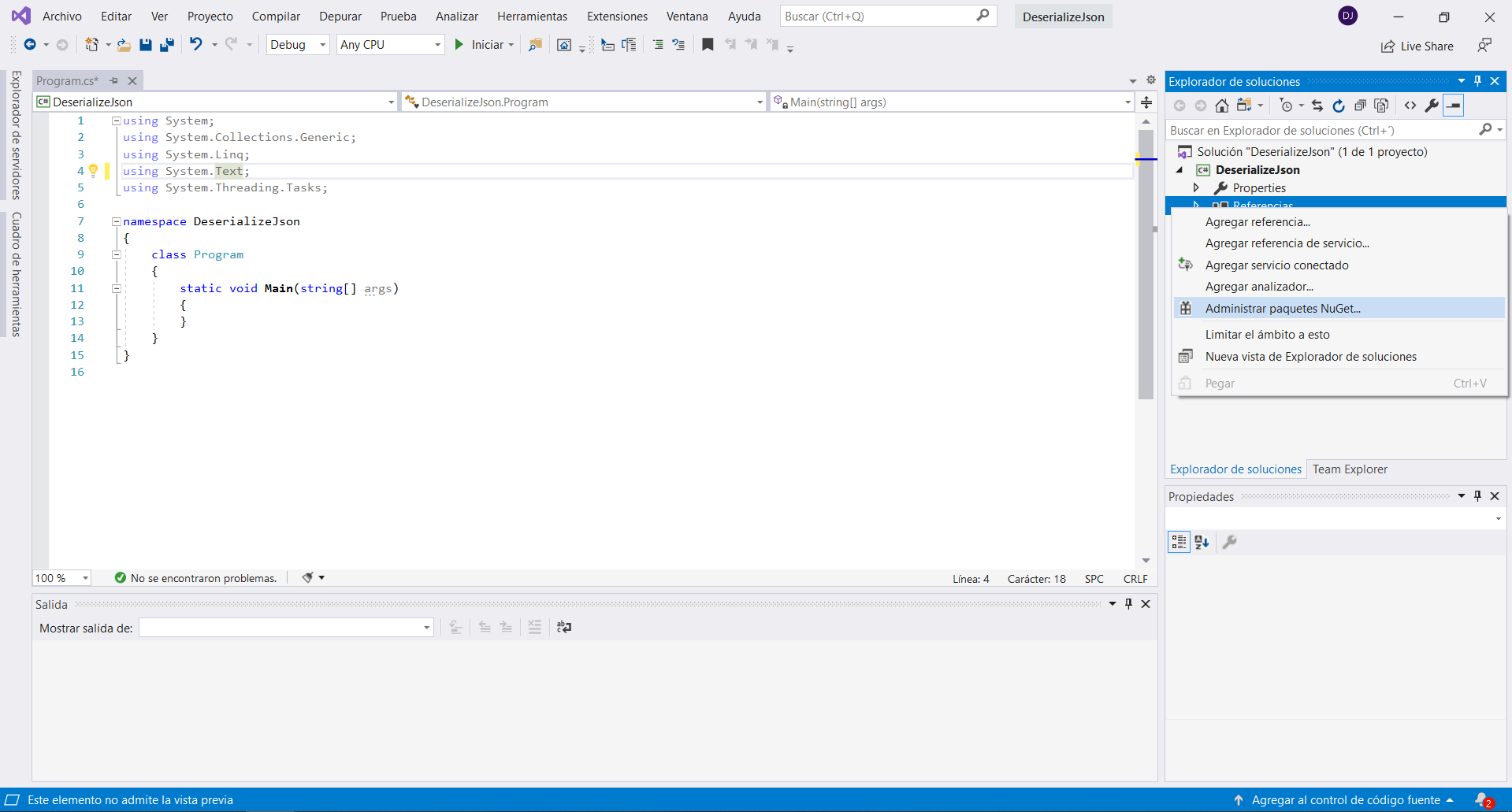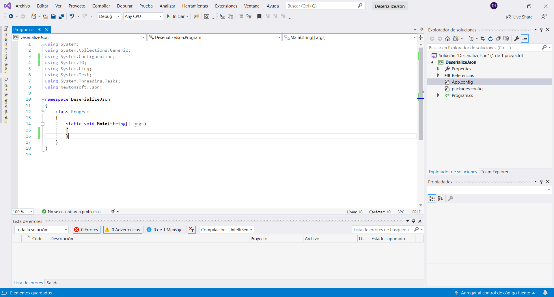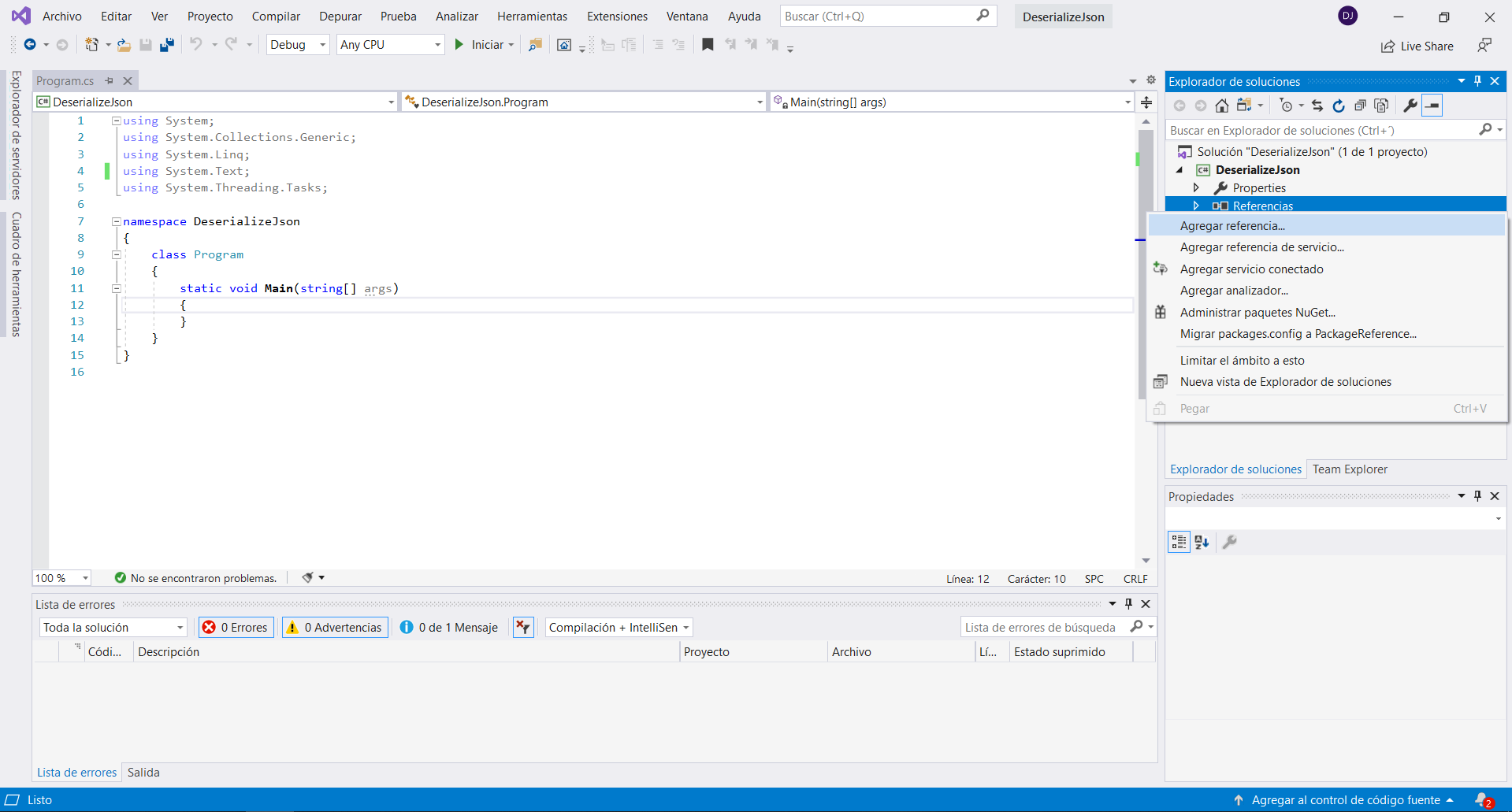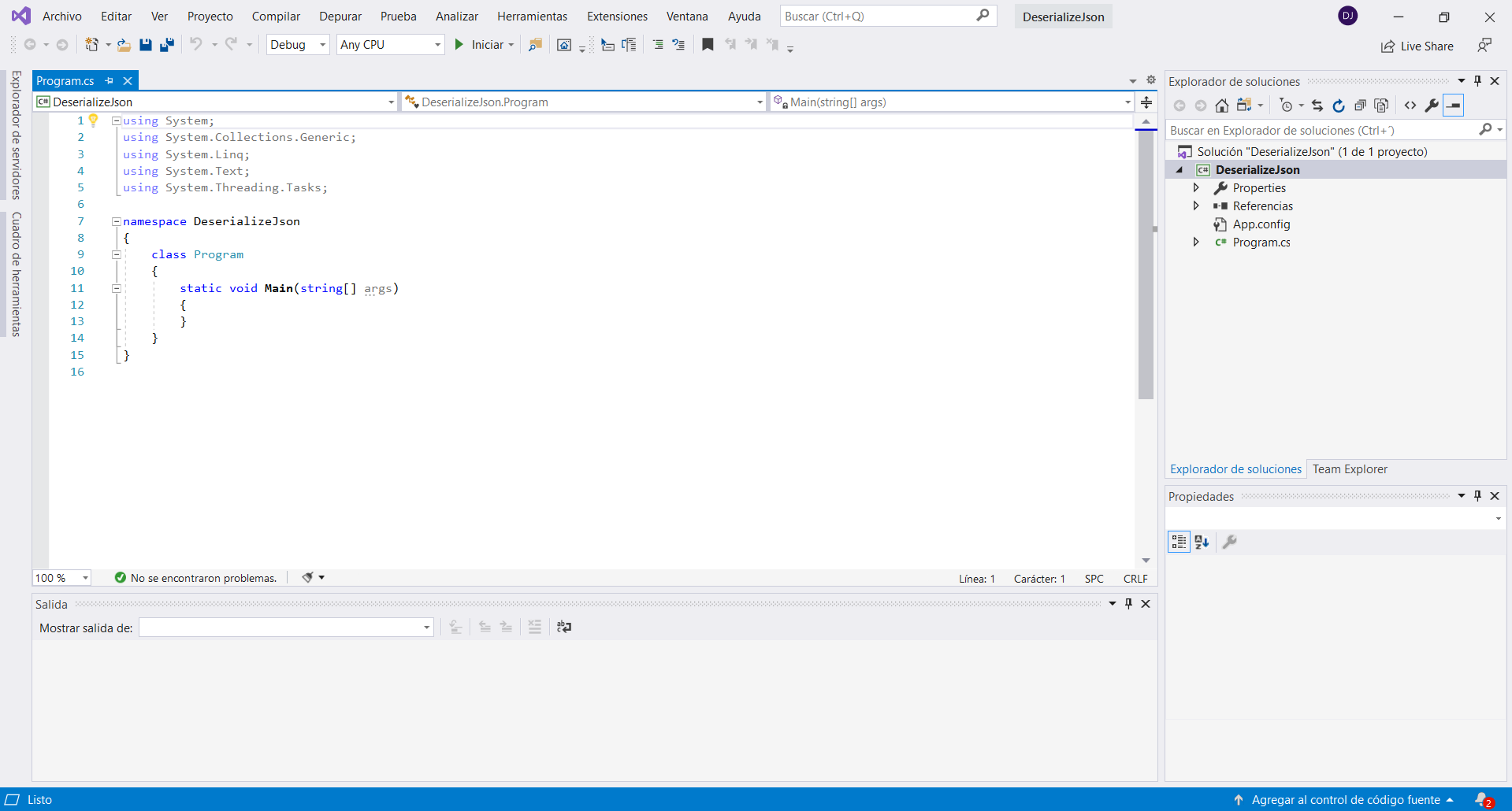 Comenzaremos como siempre abriendo nuestro Visual Studio y creando nuestra solución con un proyecto de consola para este ejemplo lo llamare DeserializeJson. Si no tienes conocimiento de como crearlo te dejo el link donde puedes aprender como hacerlo y regresar despues a este ejercicío.