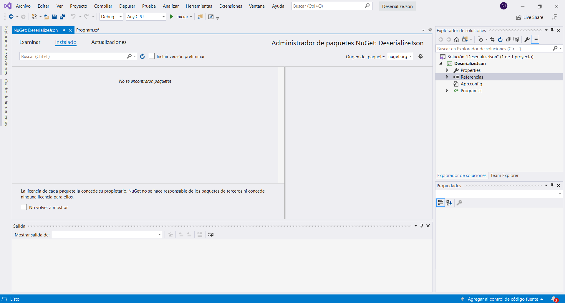 Mostrara una pestaña NuGet DeserializeJson y se posicionara en Instalado, daremos clic en Examinar y nos mostrara una nueva pestaña.