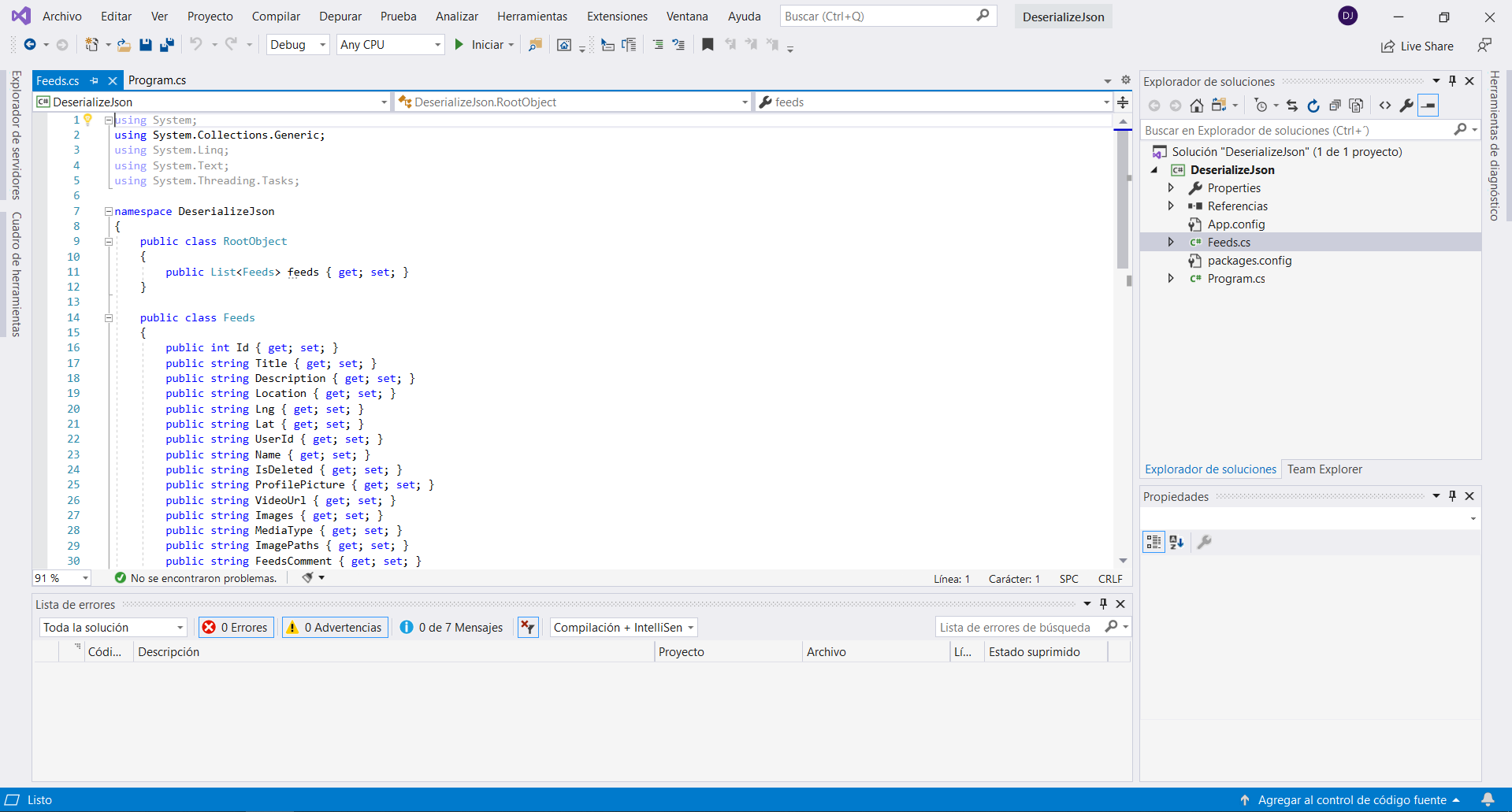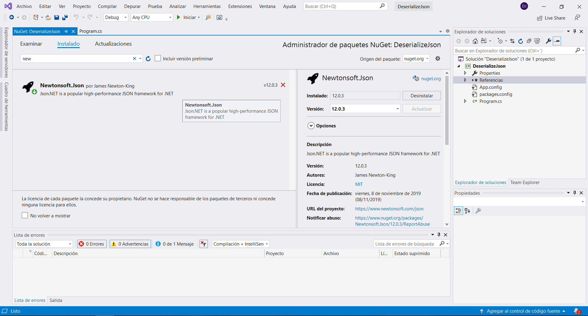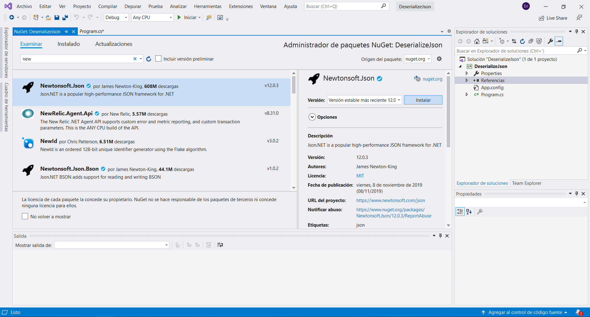 En este ejercicio deserializaremos un archivo Json y lo convertiremos en una lista de objetos con la libreria Json.Net