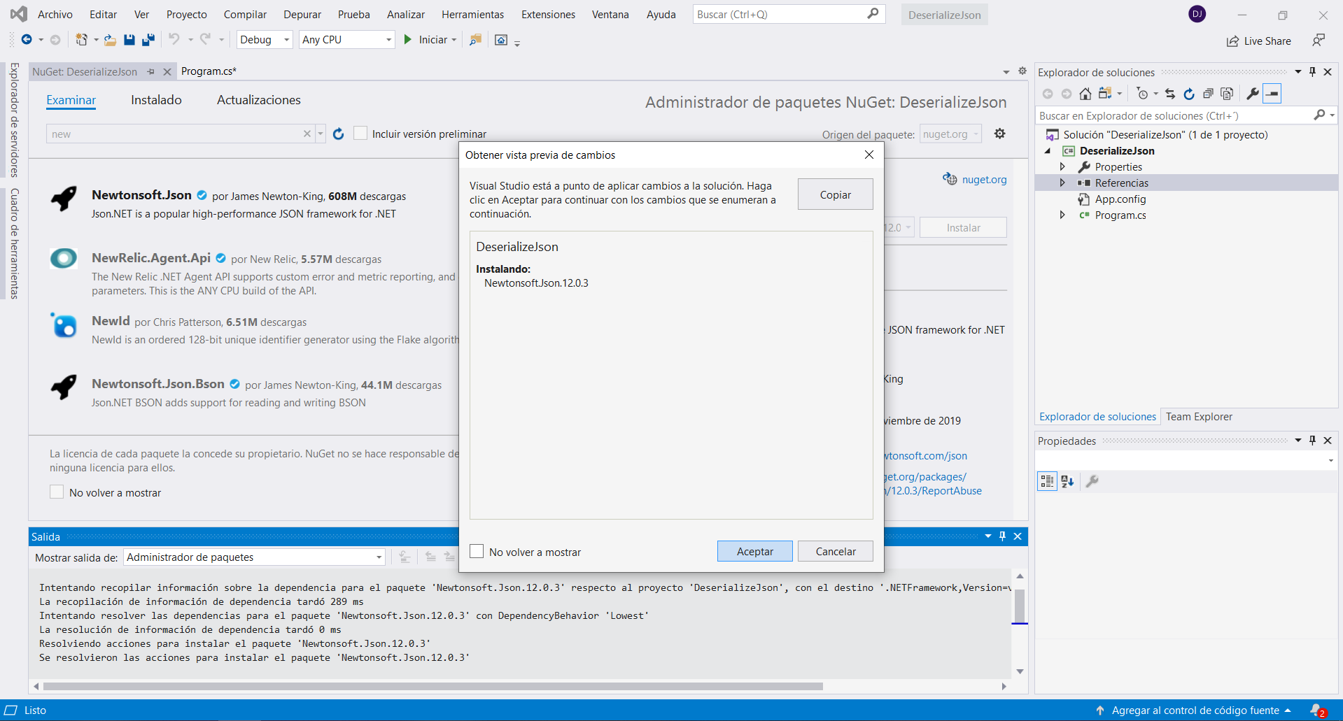 Ahora en el buscador tecleamos NewtonSoft.Json, lo seleccionaremos y daremos clic en instalar.