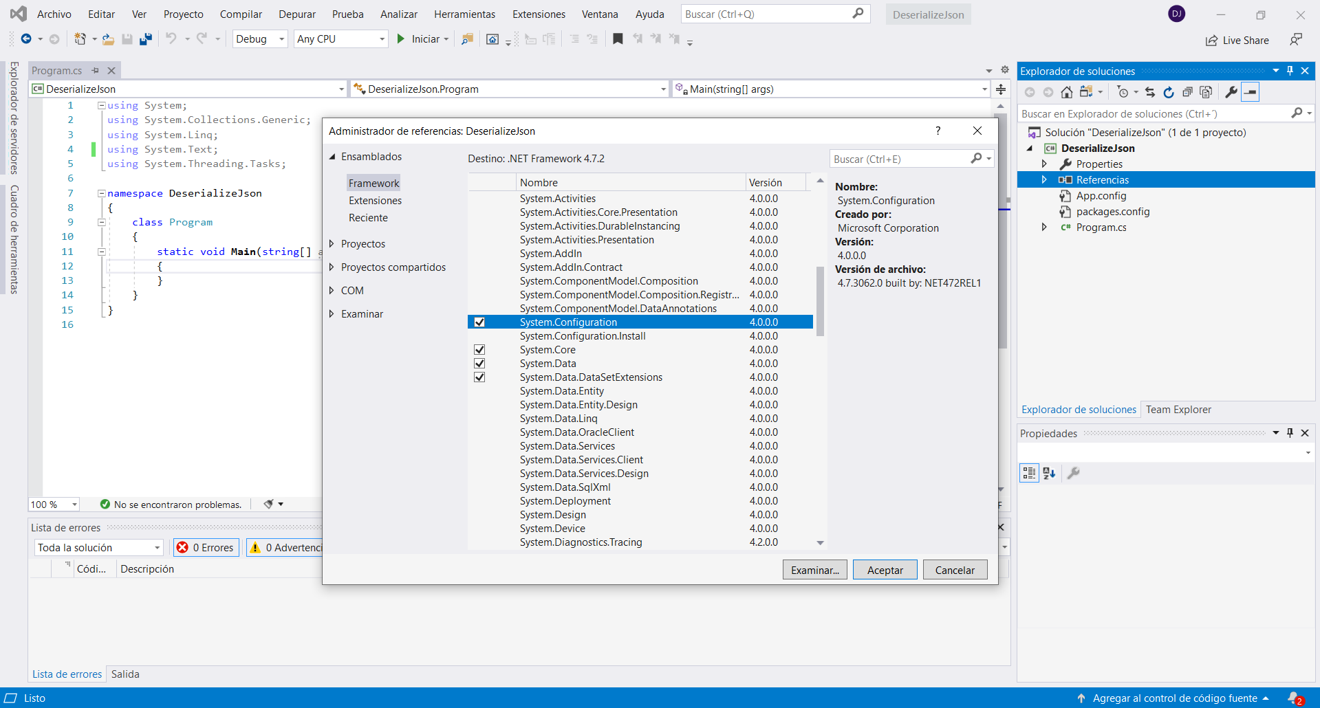 Se abrira una ventana donde seleccionaremos la sección de Ensamblados -> Framework y buscaremos System.Configuration al final marcaremos la casilla como se muestra en la siguiente imagen: