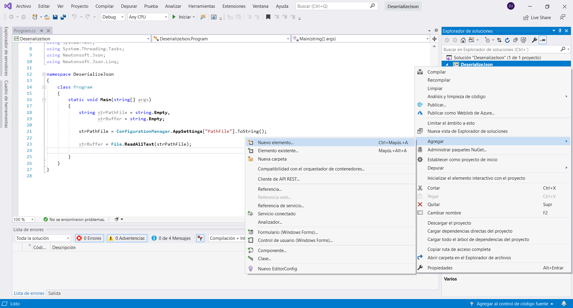 Agregaremos una clase para alojar nuestros datos de la forma correcta y poderlos manejar en memoria, nos posicionamos en nuestro Explorador de soluciones y damos clic derecho en el nombre del proyecto DeserializeJson despues en Agregar y Nuevo elemento....