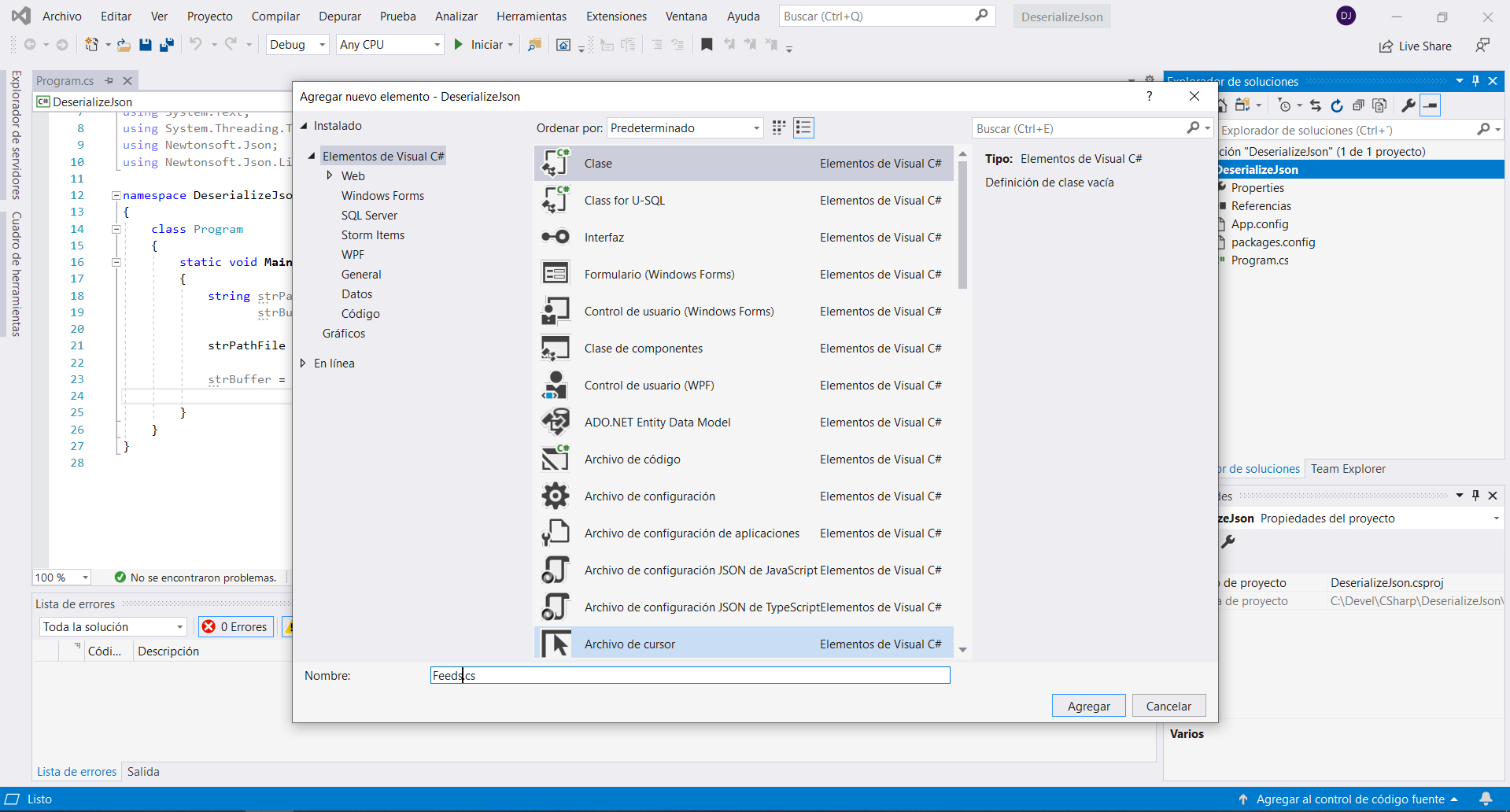 Seleccionamos Elementos de Visual C# y cuando nos despliegue el contenido seleccionamos Clase y en la nombraremos Feeds, al final daremos clic en Agregar.