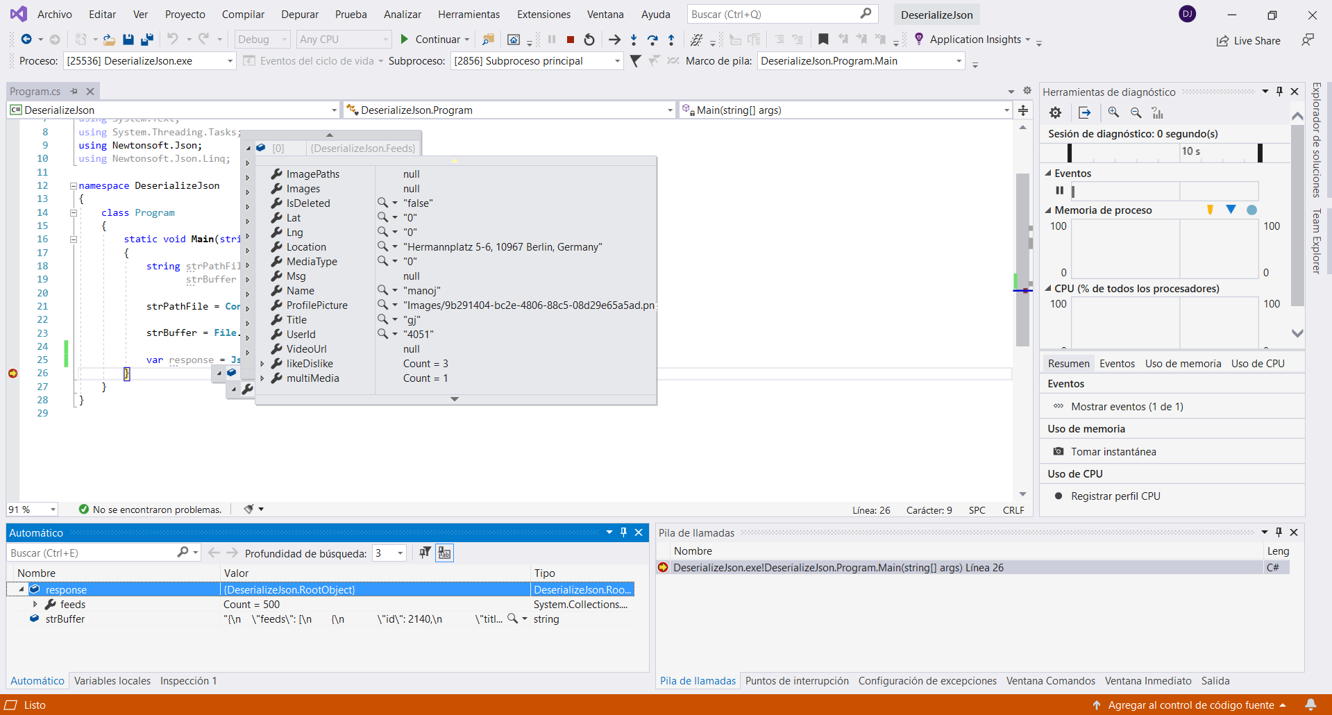 Como podemos visualizar el contenido del archivo ha sido convertido exitosamente a objetos tipo RootObject y ahora podemos realizar el tratamiento que querramos a este objeto.