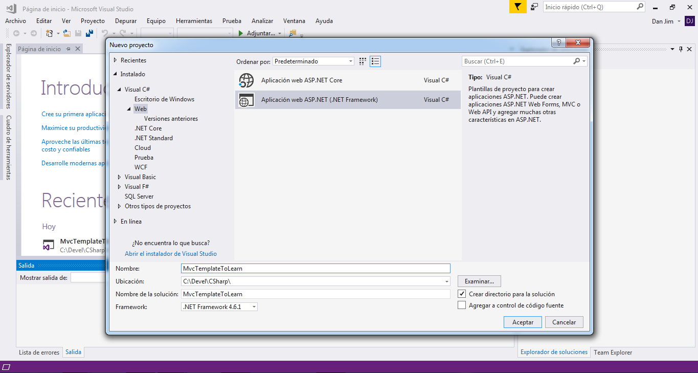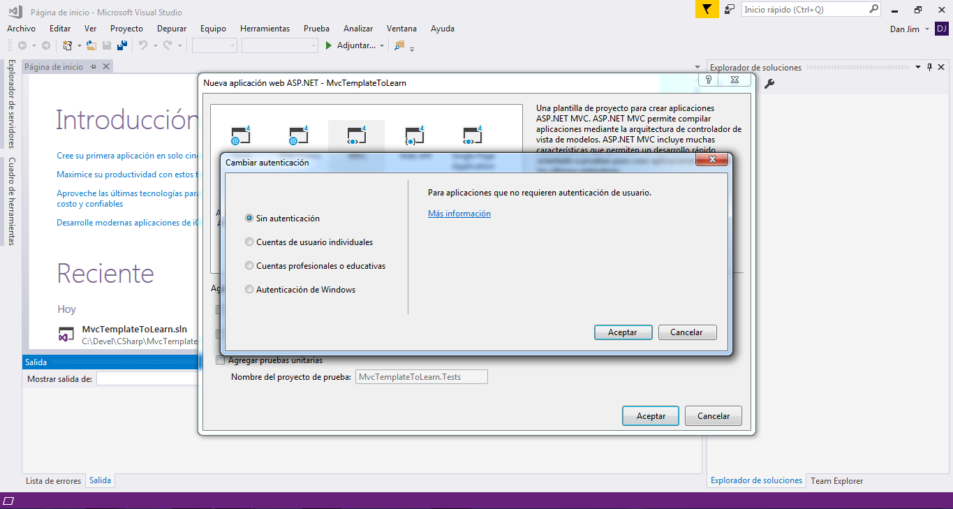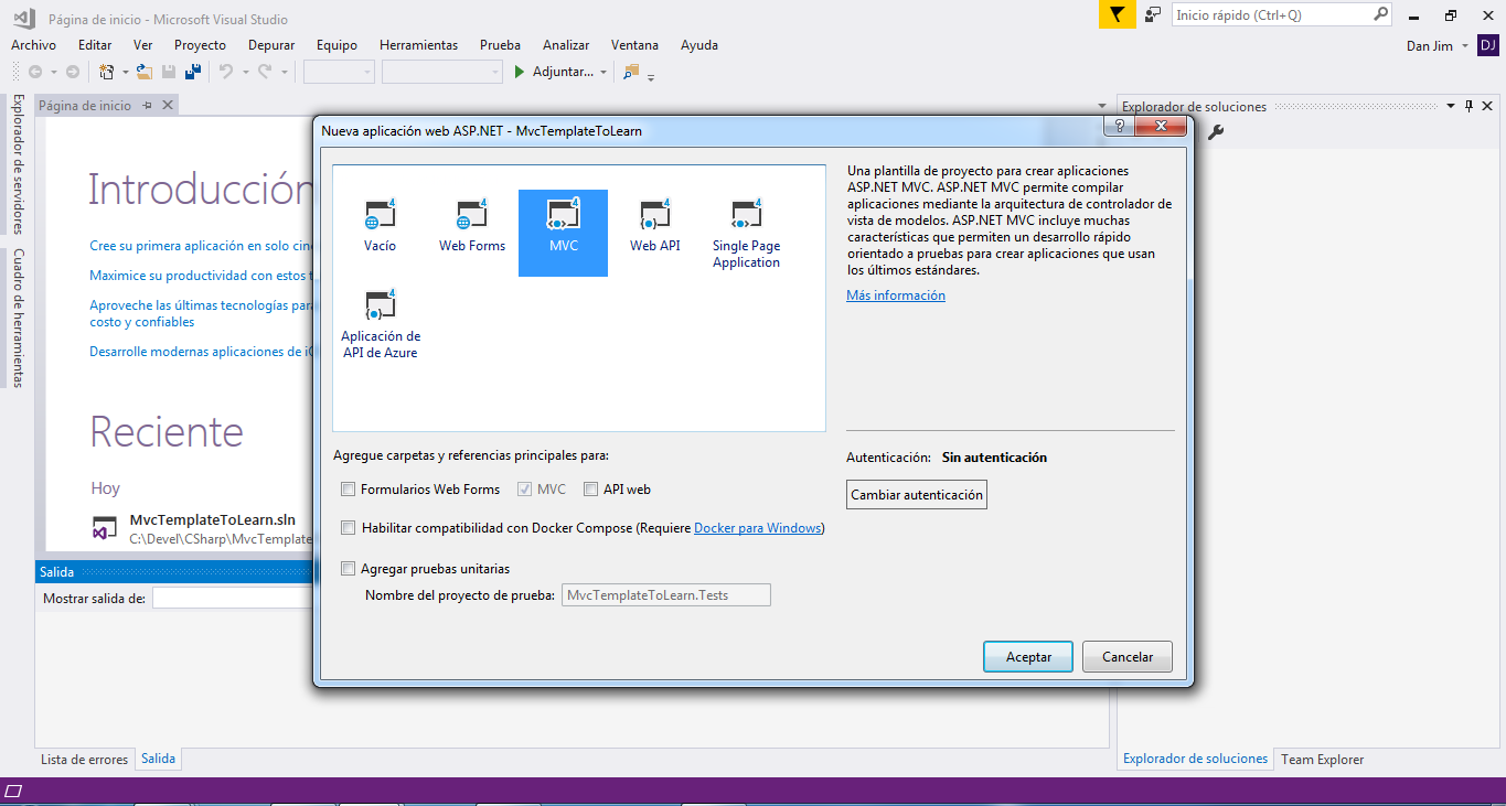 2.- Iremos al menu Archivo -> Nuevo -> Proyecto 3.- Nos colocaremos en Instalado -> Visual C# -> Web -> Aplicación web ASP.NET(Net Framework) 4.- Daremos nombre al proyecto, en este caso sera MVCTemplateToLearn 5.- Seleccionaremos la opción MVC y en el lado derecho existe un boton que dice cambiar autenticación daremos click Sin Autenticacion6.- Daremos click en el boton aceptar y esperaremos a que Visual Studio cree el proyecto.