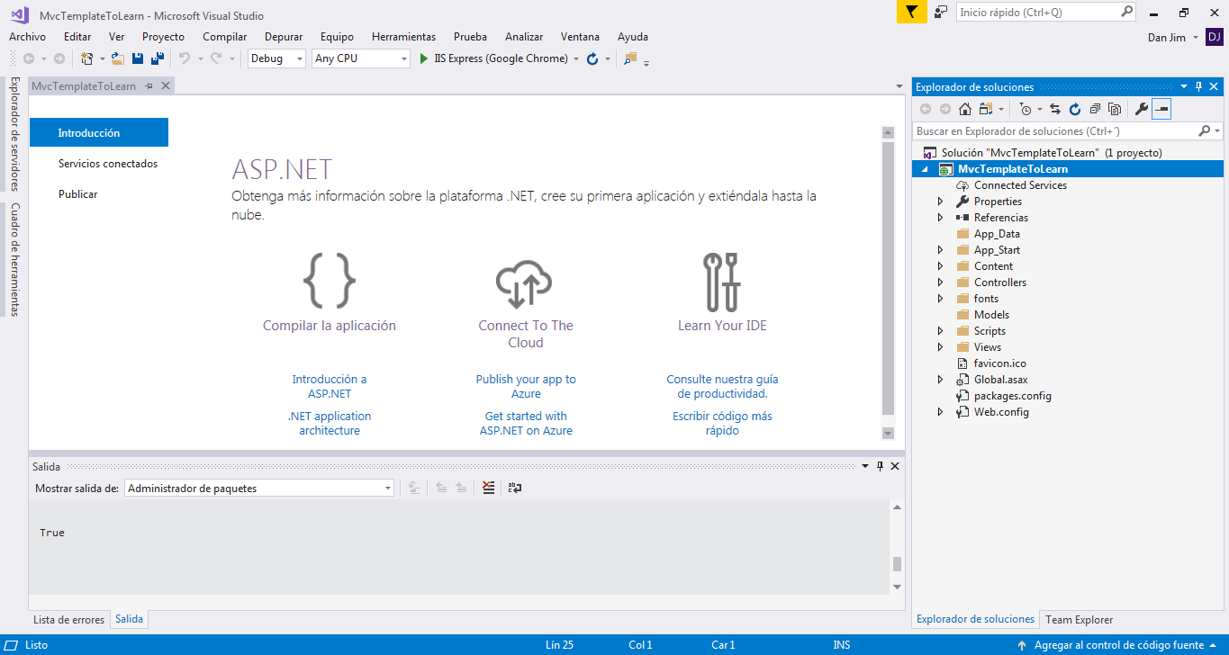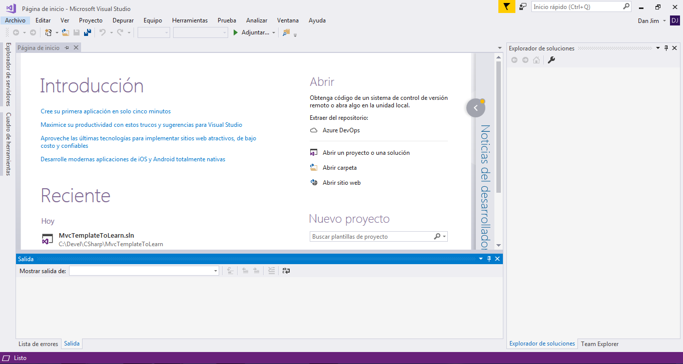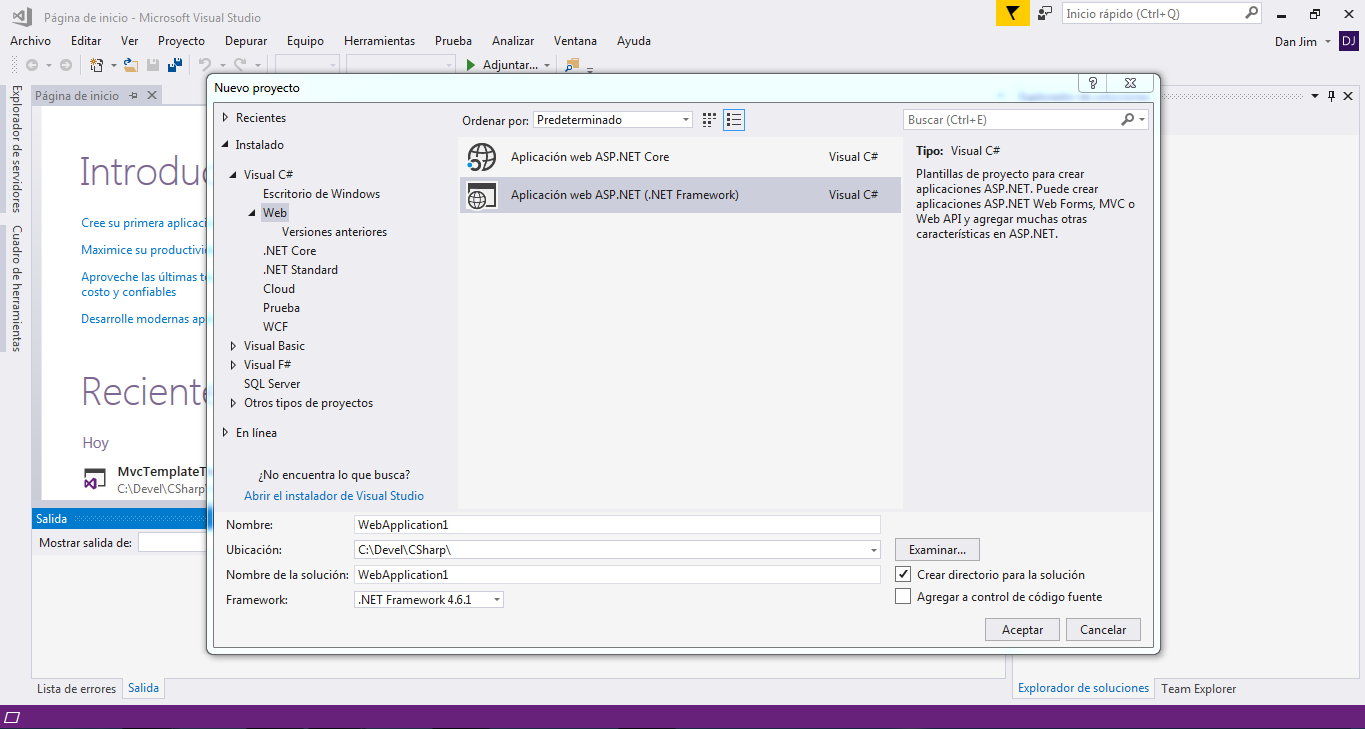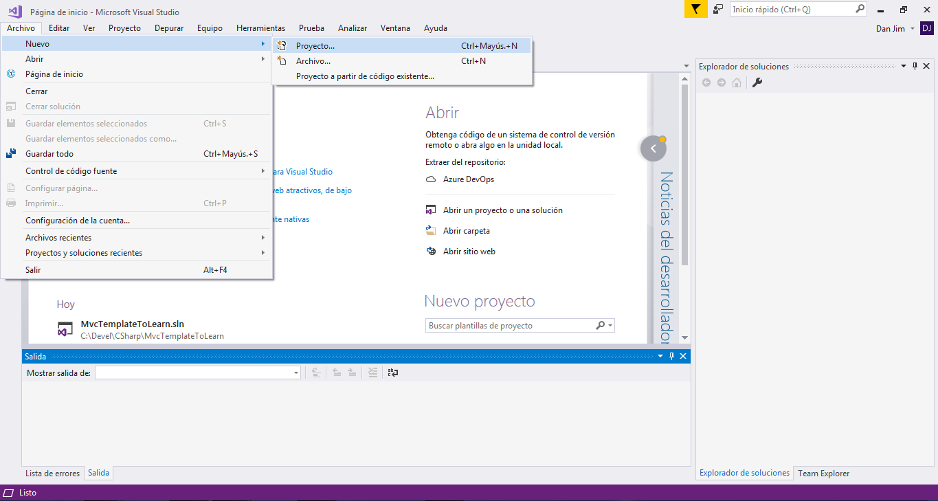 2.- Iremos al menu Archivo -> Nuevo -> Proyecto 3.- Nos colocaremos en Instalado -> Visual C# -> Web -> Aplicación web ASP.NET(Net Framework) 4.- Daremos nombre al proyecto, en este caso sera MVCTemplateToLearn 5.- Seleccionaremos la opción MVC y en el lado derecho existe un boton que dice cambiar autenticación daremos click Sin Autenticacion6.- Daremos click en el boton aceptar y esperaremos a que Visual Studio cree el proyecto.