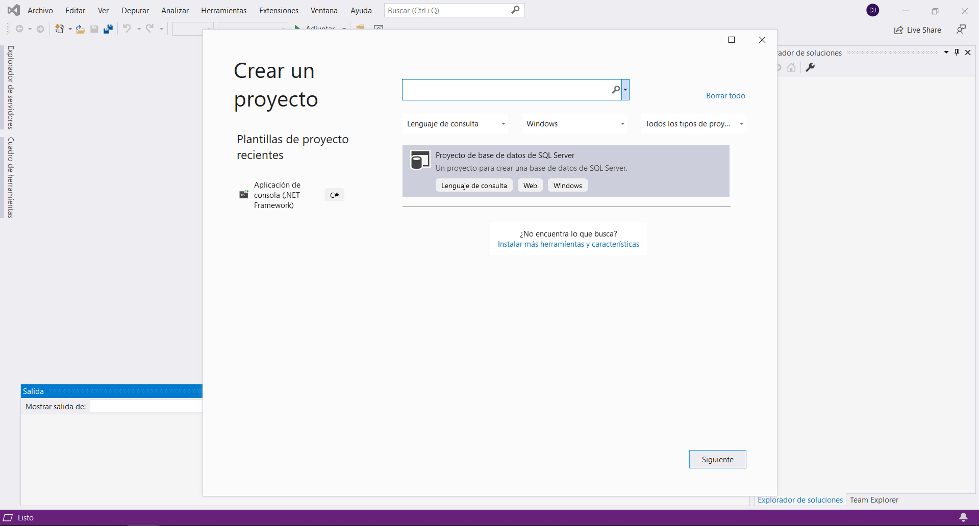 Se mostrara una ventana donde seleccionaremos el Lenguaje que sera Lenguaje de consulta en Plataforma seleccionaremos Windows , despúes Tipo de Proyecto será Todos los tipos de proyecto y finalmente seleccionaremos Proyecto de base de datos de SQL Server y quedara de la siguiente forma: