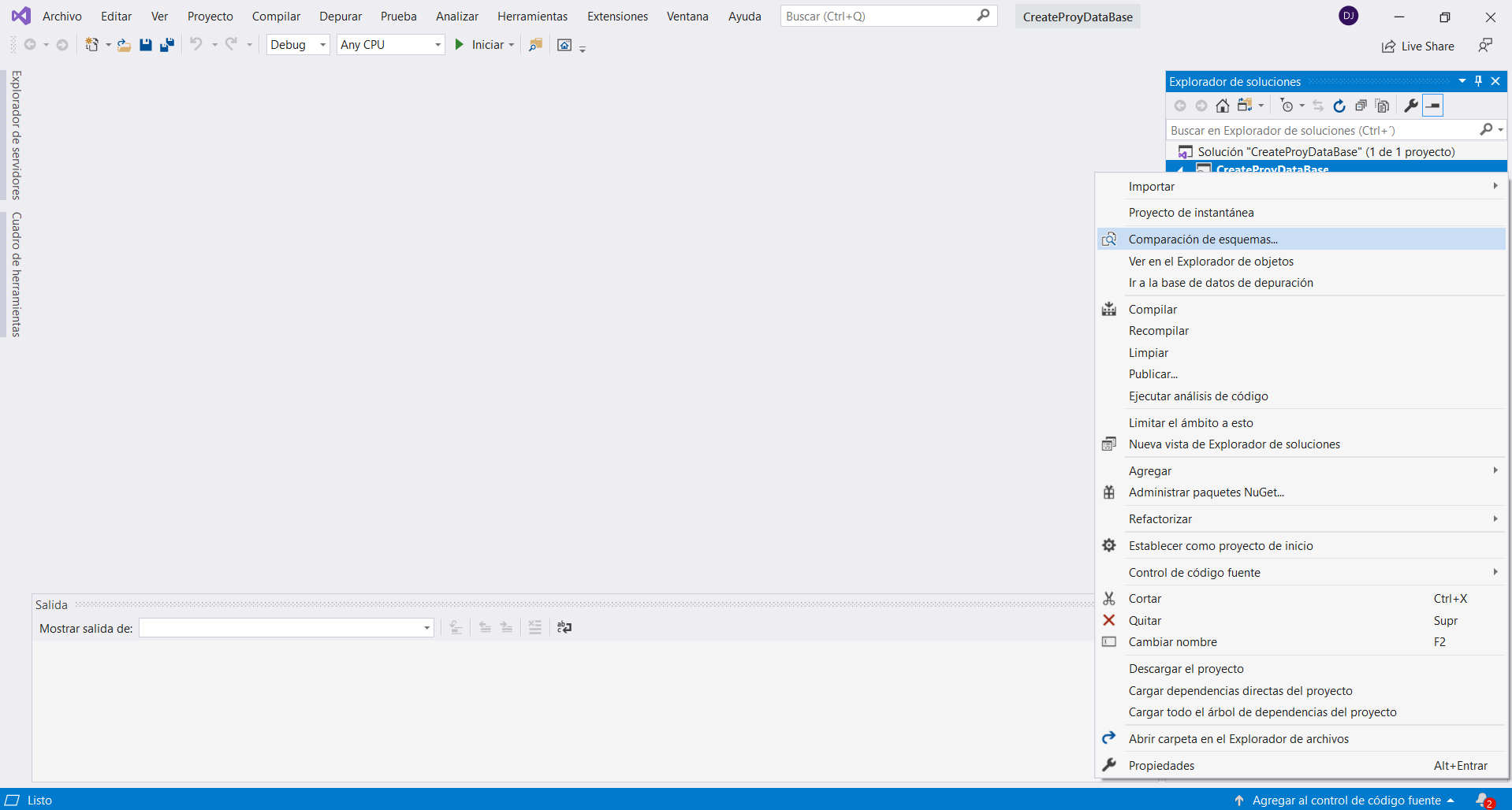 Para corroborar que el proyecto es un proyecto de base de datos daremos click derecho en el proyecto y tendra que desplegarnos el menu y debe estar la opción Comparación de esquemas....
