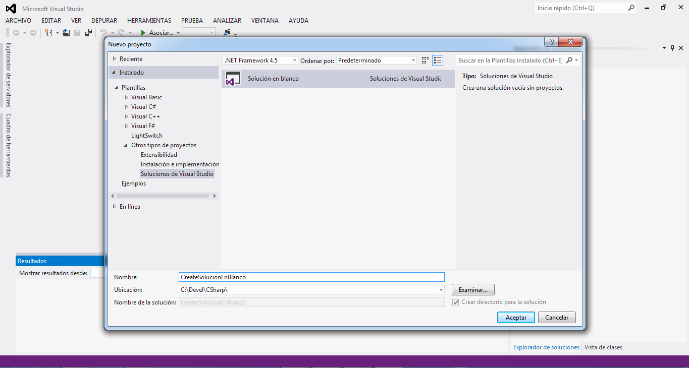En la sección Plantillas en Otros tipos de proyectos despúes Soluciones de Visual Studio y finalmente Solución en Blanco, daremos nombre a nuestra solución y finalmente daremos clic en Aceptar.