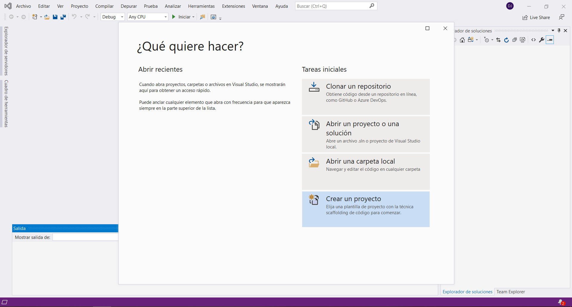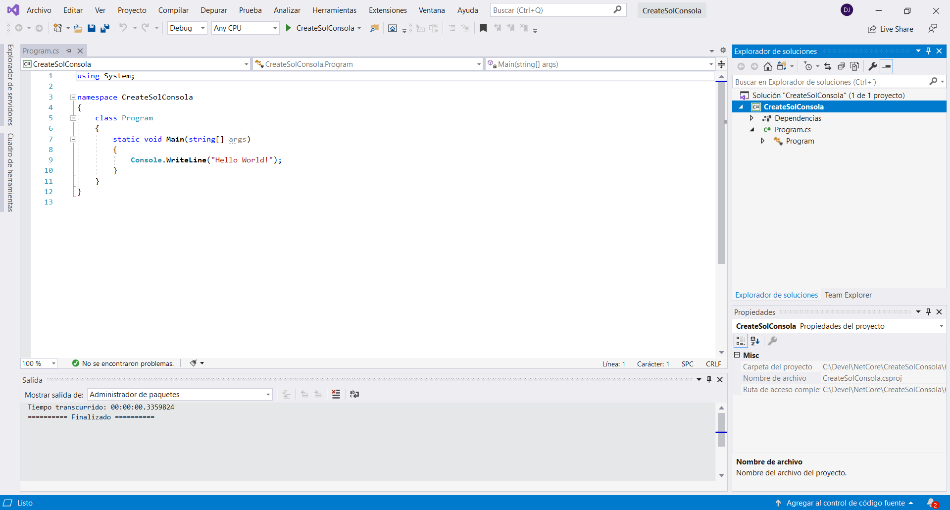 Daremos clic en Crear y esperaremos que Visual Studio cree el proyecto. Al finalizar quedara algo parecido a esto: