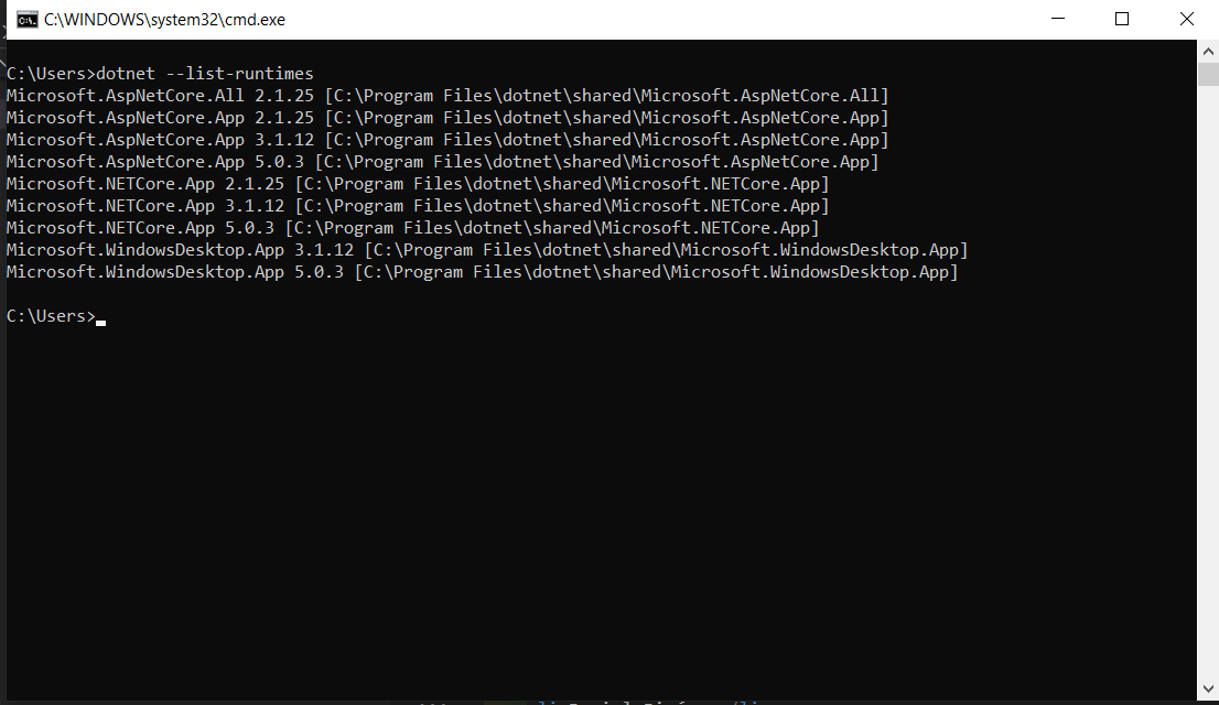 R: Ejecuta el siguiente comando en un cmd de windows: dotnet --list-runtimes