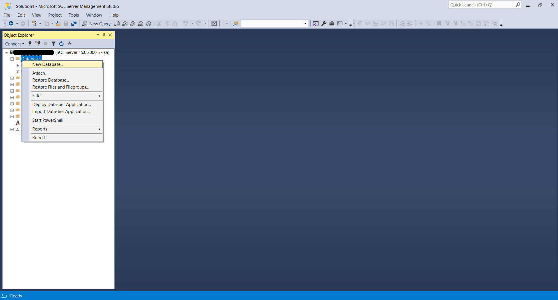 En el explorador de objetos localizamos la sección Databases, damos clic derecho y seleccionamos la primer opción New Database ....