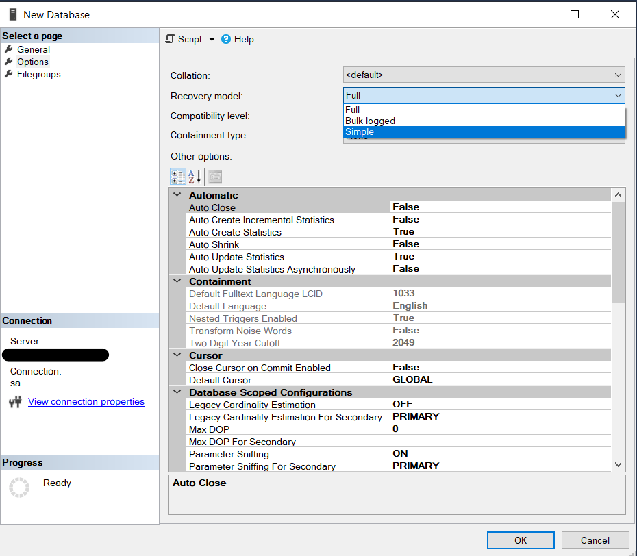 En el menu izquierdo Select a page seleccionamos Options y buscamos Recovery model (dejo el link en referencias para mas profundidad en este tema), desplegamos el menu.
