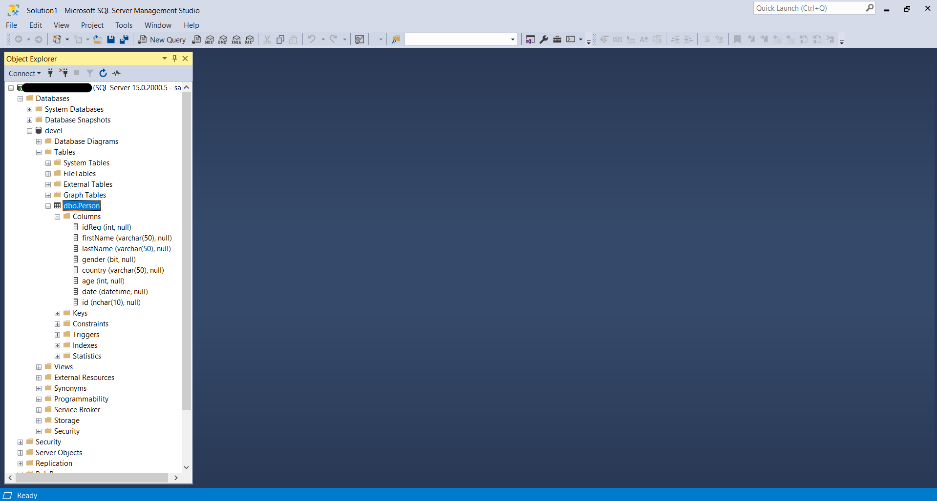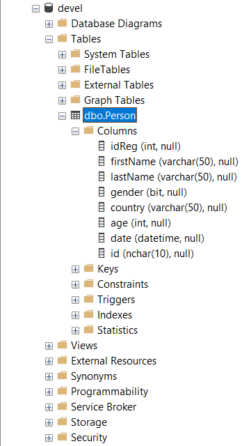 Cuando el sistema termine de hacer Refresh nos mostrara la tabla, lo que tenemos que hacer posteriormente es expandir sobre el nombre de la tabla dbo.Person y despues expandir Columns para visualizar el nombre de los campos y sus datos.