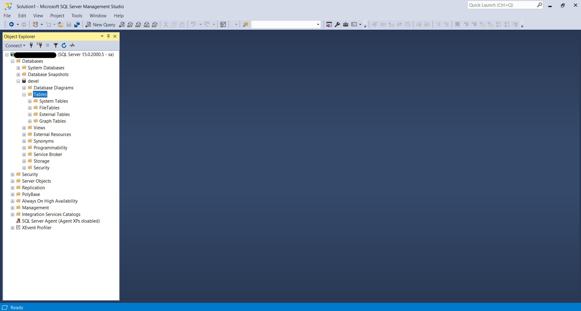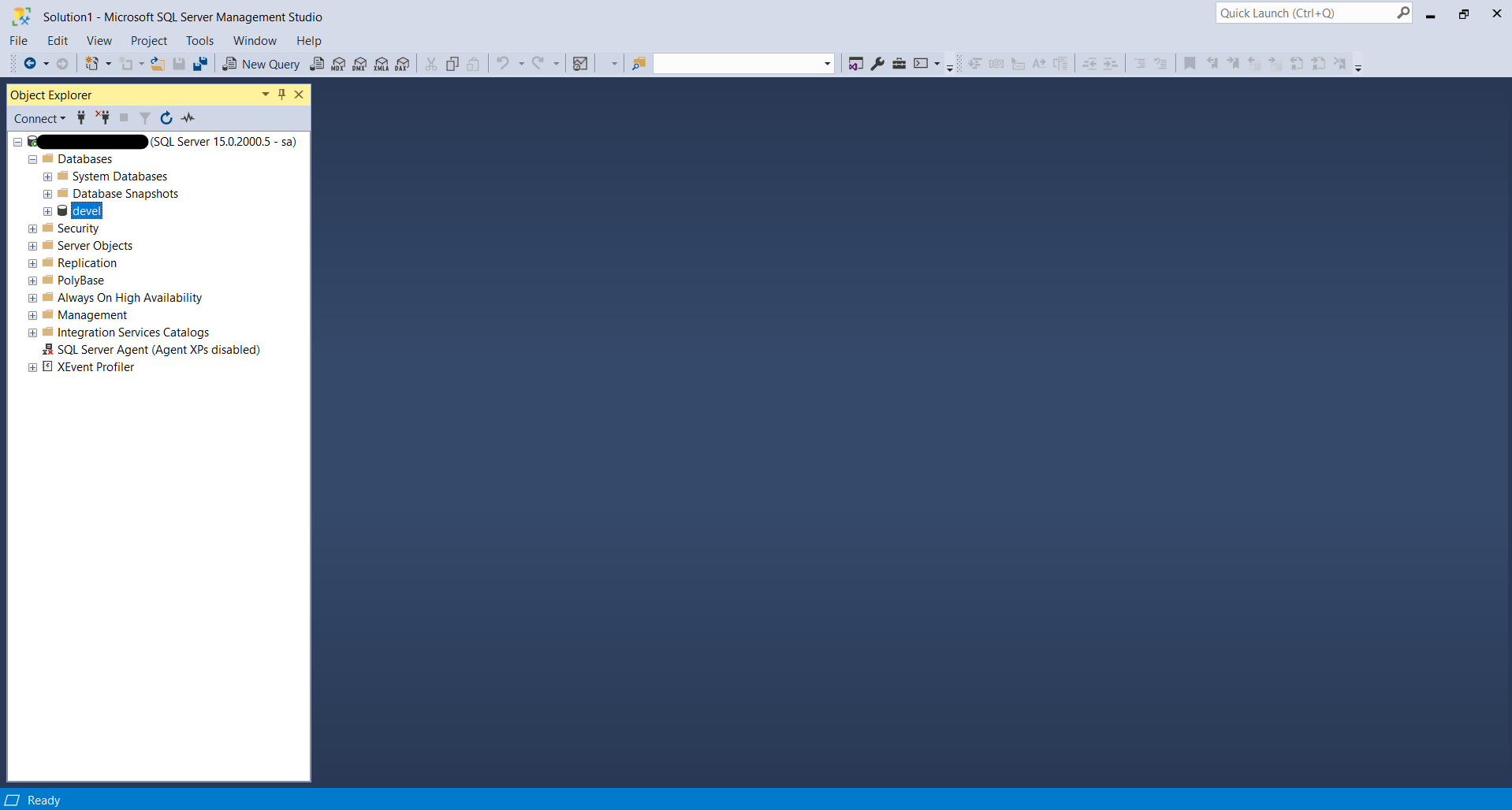 Comenzaremos abriendo Microsofot SQL Server Management Studio y haciendo Login para colocarnos despues en nuestra base de datos devel(en mi caso) todo desde nuestro Object Explorer.