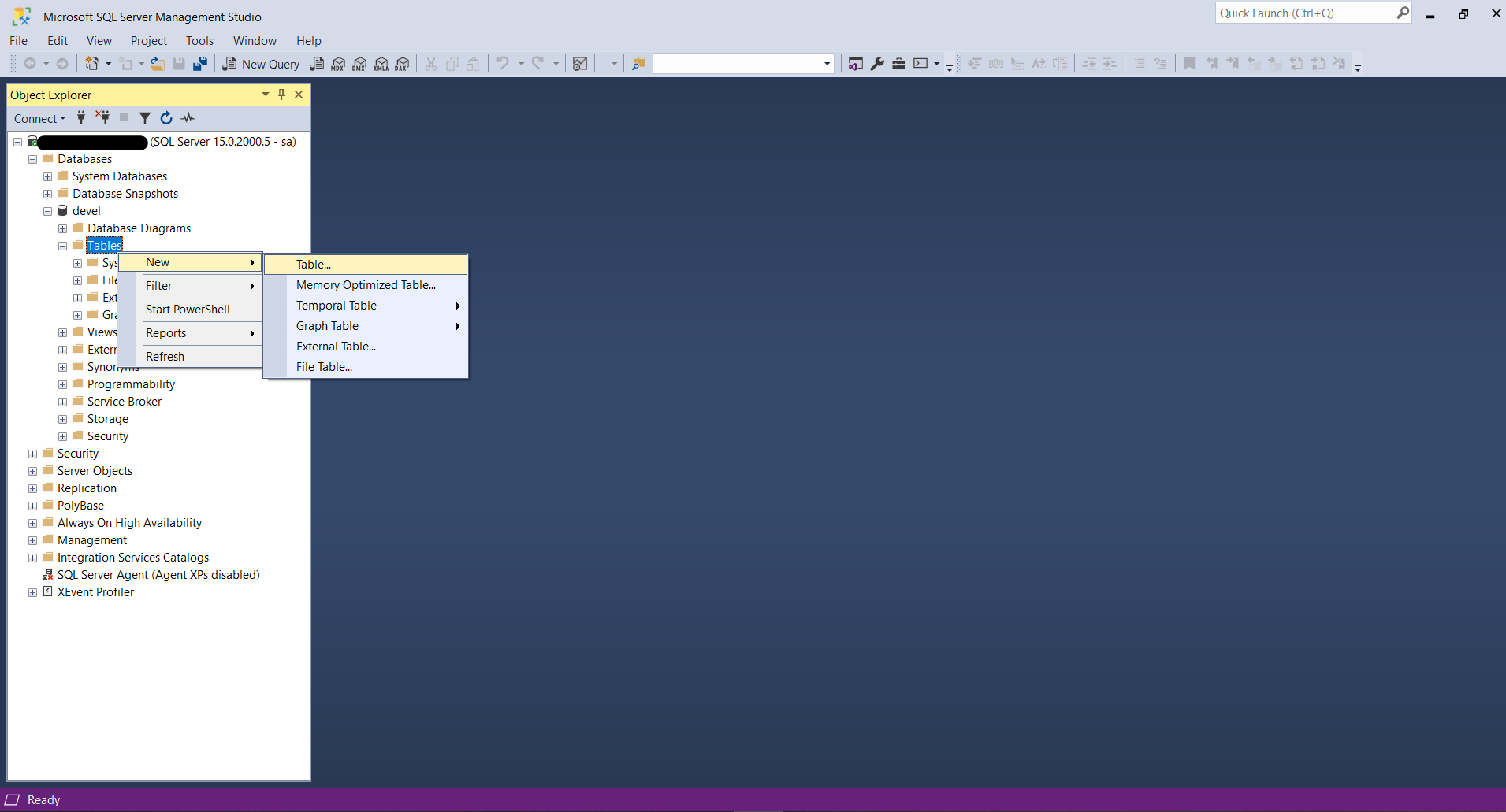 Damos clic derecho, nos posicionamos en New -> Table ... y damos clic.