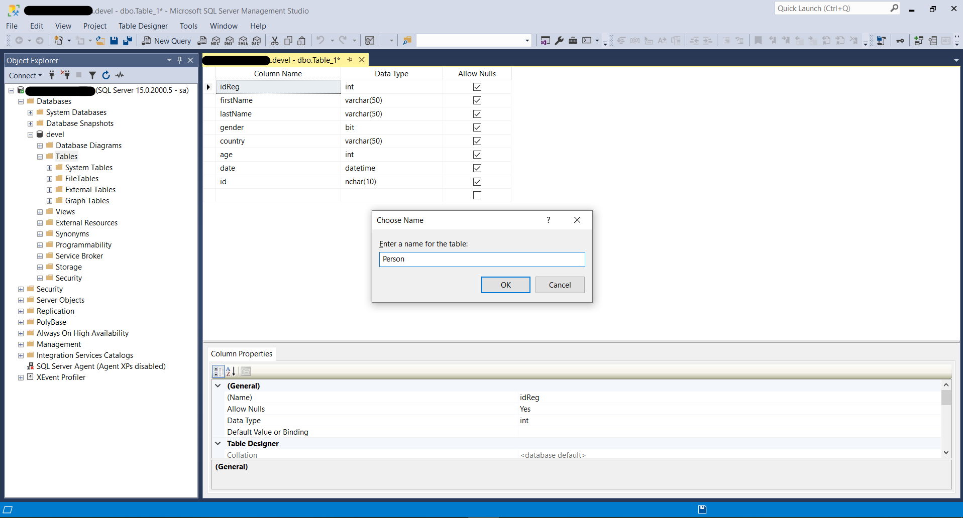Una vez terminada la declaración de los campos y sus tipos de datos procedemos guardar para crear la tabla lo realizamos presionando la tecla Ctrl + s, en este caso se llamara Person.