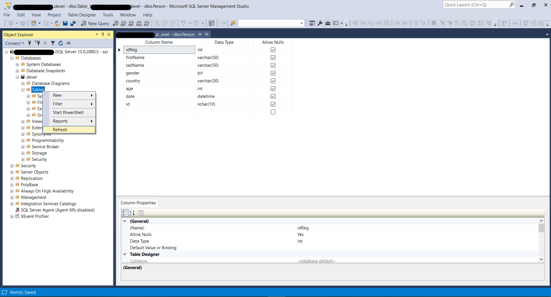 Una vez realizado esto en el Object Explorer damos clic derecho sobre Tables, buscamos la palabra Refresh y damos clic.