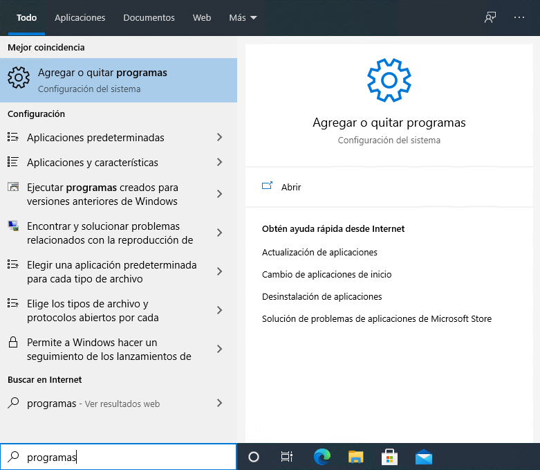 Comenzamos con presionar la tecla Windows y escribimos Agregar o quitar programas, damos clic o Enter.
