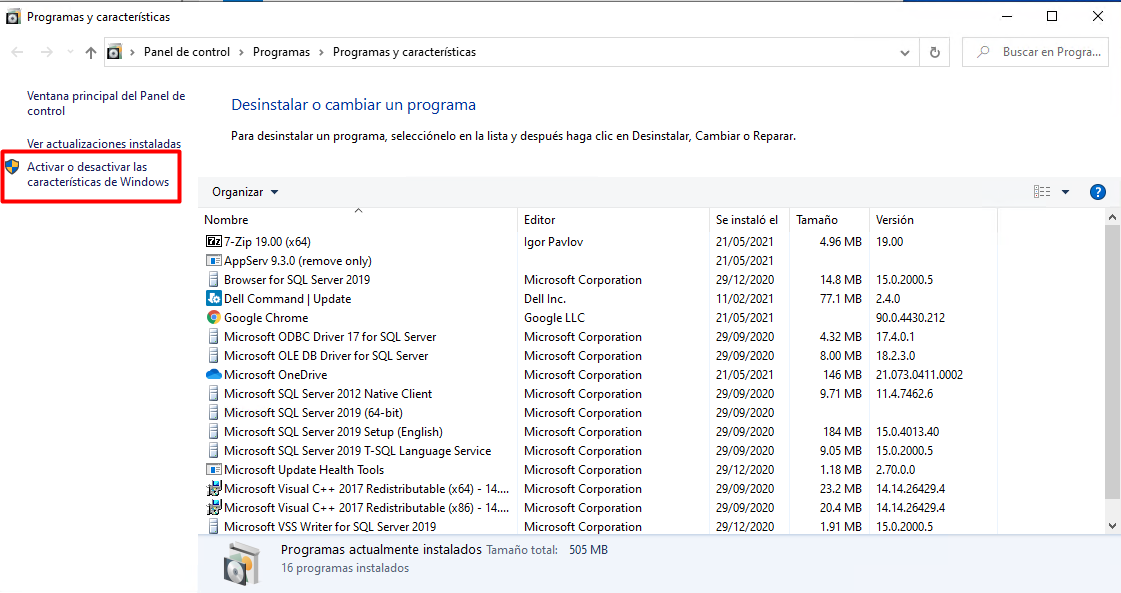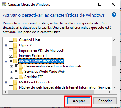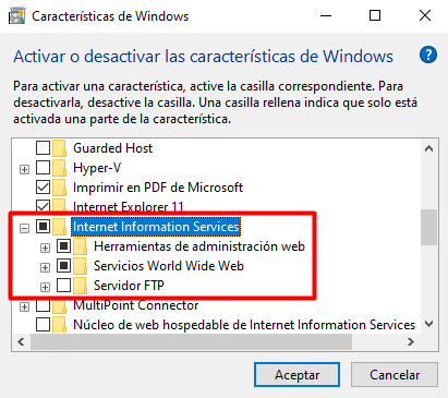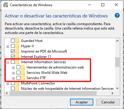 En este ejercicio activaremos IIS en el sistema operativo Windows 10