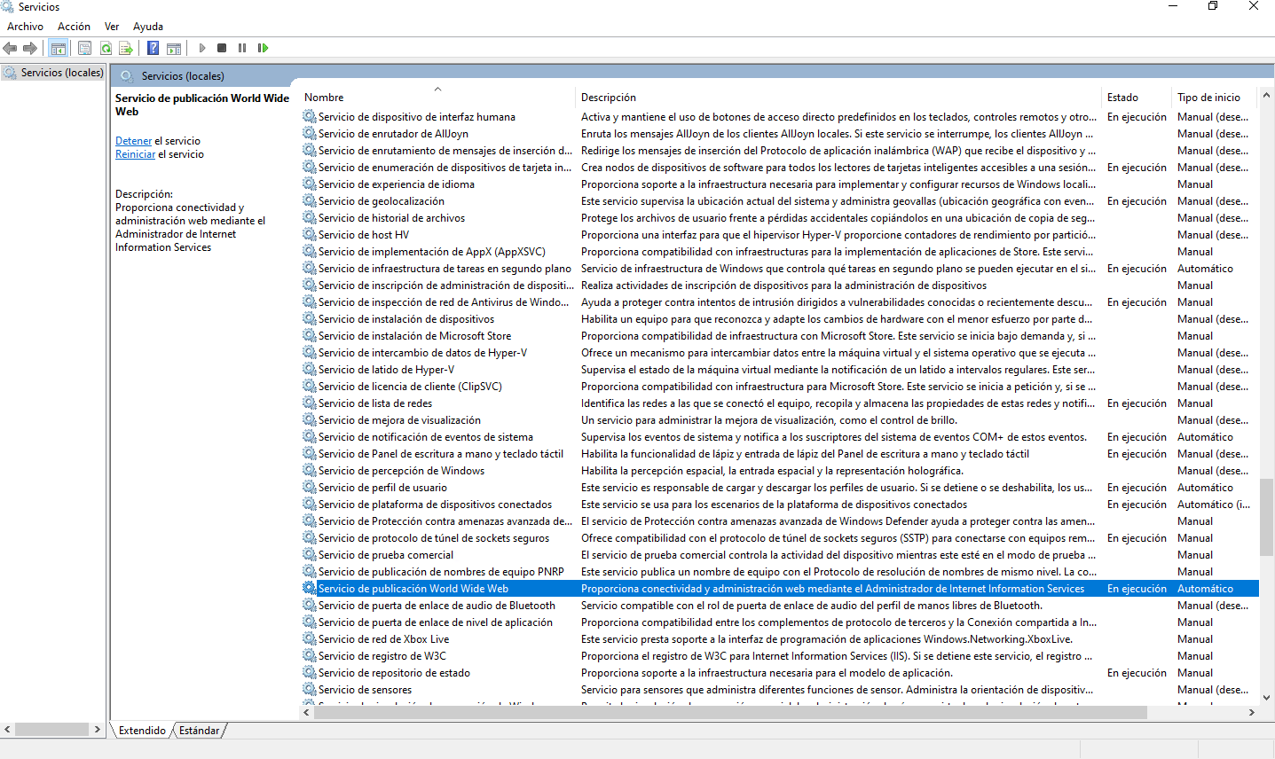 Buscamos el servicio con el nombre Servicio de publicación World Wide Web y nos aseguramos que se este ejecutando.